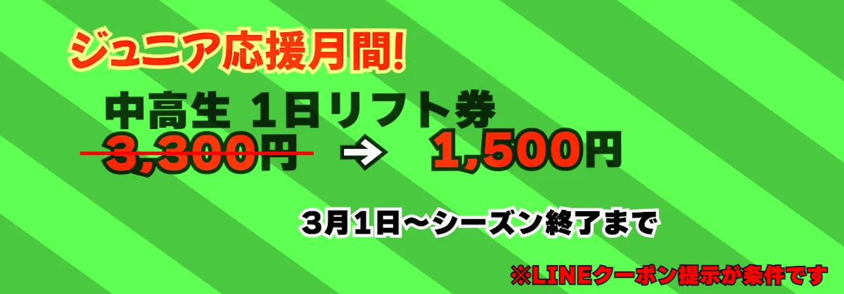 3月1日より 中高生リフト1日券1500円(年齢証明証必須)!