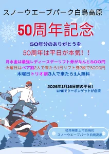 50周年記念は平日が本気です!! 2025年12月14日 スノーウエーブパーク白鳥高原は1975年にシングルリフト1基からスタート! 今年50年のありがとうを企画いたしました。LINEクーポンで特別サービスが受けられます。https://lin.ee/EOdd6vQ 月水金 最強レディースデー! 1日券が500円 火曜日 ペア割 2人で来たら1日リフト券2枚で5000円 木曜日 トリオ割 3人で来場リフト券購入で1人無料! LINEお友達登録→クーポンGET!!です